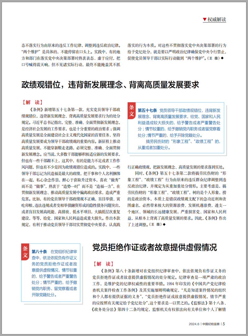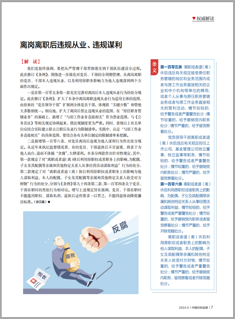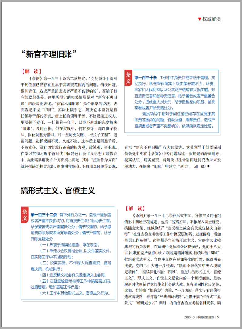 新修訂的《中國(guó)共產(chǎn)黨紀(jì)律處分條例》(以下簡(jiǎn)稱(chēng)《條例》)在總結(jié)實(shí)踐經(jīng)驗(yàn)基礎(chǔ)上,與時(shí)俱進(jìn)完善紀(jì)律規(guī)范,與 2018 年《條例》相比,新增 16 條,修改 76 條,進(jìn)一步扎緊織密制度籠子,為全面加強(qiáng)黨的紀(jì)律建設(shè)提供了重要遵循。為了幫助大家深入學(xué)習(xí)理解、貫徹執(zhí)行好《條例》,針對(duì)《條例》新增或修改的部分重點(diǎn)條文,本期我們約請(qǐng)參與《條例》修訂工作的中央紀(jì)委國(guó)家監(jiān)委法規(guī)室同志從修改背景、理解執(zhí)行等方面進(jìn)行權(quán)威解讀。