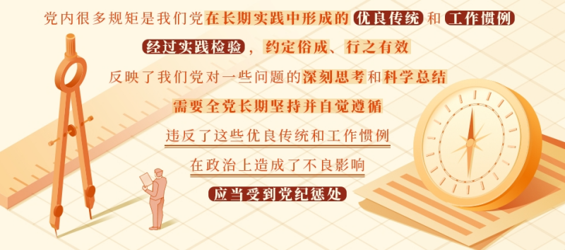 黨內很多規(guī)矩是我們黨在長期實踐中形成的優(yōu)良傳統(tǒng)和工作慣例,經過實踐檢驗,約定俗成、行之有效,反映了我們黨對一些問題的深刻思考和科學總結,需要全黨長期堅持并自覺遵循。這些規(guī)矩看著沒有白紙黑字的規(guī)定,但都是一種傳統(tǒng)、一種范式、一種要求。違反了這些優(yōu)良傳統(tǒng)和工作慣例,在政治上造成了不良影響,應當受到黨紀懲處?! ?/span>