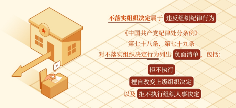 執(zhí)行黨的決定,服從組織分配,積極完成黨的任務(wù)是黨員必須履行的義務(wù)。不落實(shí)組織決定屬于違反組織紀(jì)律行為?!吨袊?guó)共產(chǎn)黨紀(jì)律處分條例》第七十八條、第七十九條對(duì)不落實(shí)組織決定行為列出負(fù)面清單,作出處分規(guī)定——