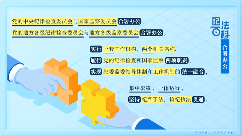 《中國共產(chǎn)黨紀(jì)律檢查委員會工作條例》第七條規(guī)定:黨的中央紀(jì)律檢查委員會與國家監(jiān)察委員會合署辦公,黨的地方各級紀(jì)律檢查委員會與地方各級監(jiān)察委員會合署辦公,實(shí)行一套工作機(jī)構(gòu)、兩個機(jī)關(guān)名稱,履行黨的紀(jì)律檢查和國家監(jiān)察兩項(xiàng)職責(zé),實(shí)現(xiàn)紀(jì)委監(jiān)委領(lǐng)導(dǎo)體制和工作機(jī)制的統(tǒng)一融合,集中決策、一體運(yùn)行,堅持紀(jì)嚴(yán)于法,執(zhí)紀(jì)執(zhí)法貫通。