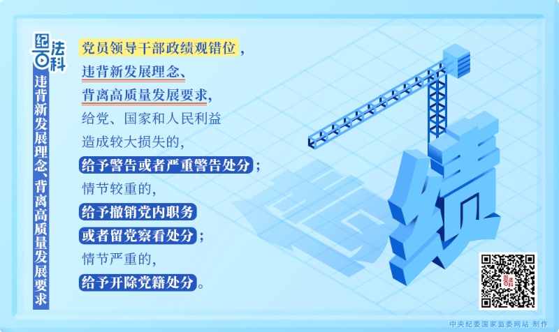 《中國共產(chǎn)黨紀律處分條例》第五十七條規(guī)定:黨員領(lǐng)導干部政績觀錯位,違背新發(fā)展理念、背離高質(zhì)量發(fā)展要求,給黨、國家和人民利益造成較大損失的,給予警告或者嚴重警告處分;情節(jié)較重的,給予撤銷黨內(nèi)職務(wù)或者留黨察看處分;情節(jié)嚴重的,給予開除黨籍處分。