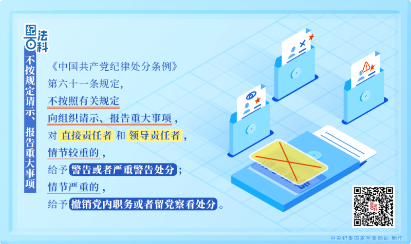 《中國共產(chǎn)黨紀律處分條例》第六十一條規(guī)定,不按照有關規(guī)定向組織請示、報告重大事項,對直接責任者和領導責任者,情節(jié)較重的,給予警告或者嚴重警告處分;情節(jié)嚴重的,給予撤銷黨內(nèi)職務或者留黨察看處分。
