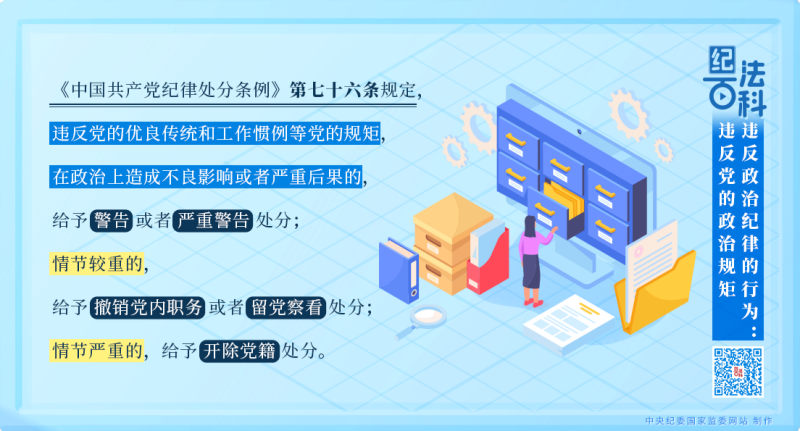 《中國共產(chǎn)黨紀(jì)律處分條例》第七十六條規(guī)定,違反黨的優(yōu)良傳統(tǒng)和工作慣例等黨的規(guī)矩,在政治上造成不良影響或者嚴(yán)重后果的,給予警告或者嚴(yán)重警告處分;情節(jié)較重的,給予撤銷黨內(nèi)職務(wù)或者留黨察看處分;情節(jié)嚴(yán)重的,給予開除黨籍處分。
