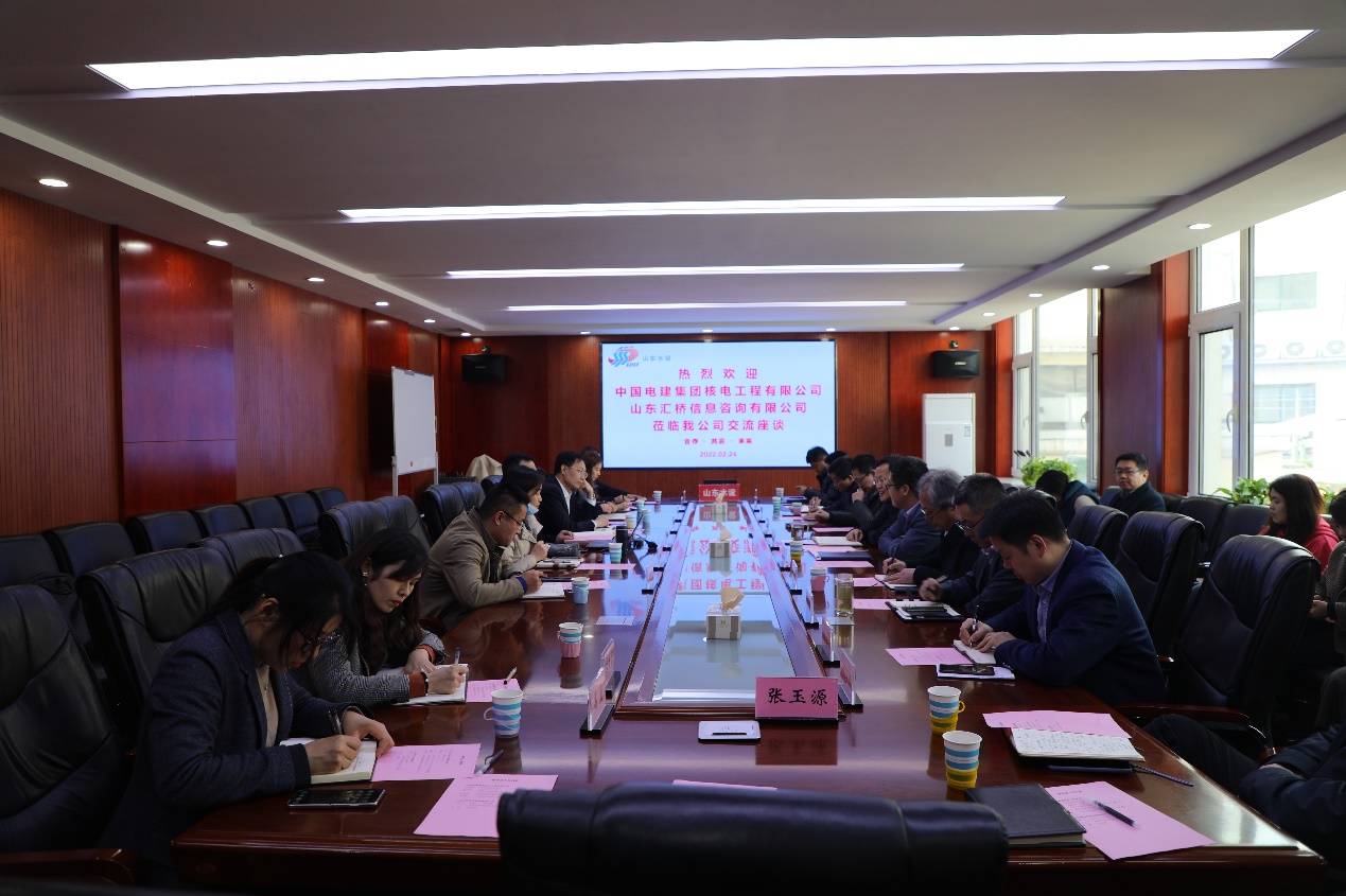 王洪濤對劉大賓與門楓葉一行的到來表示歡迎,對中國電建集團(tuán)核電工程公司在高新技術(shù)企業(yè)認(rèn)定、研發(fā)費(fèi)用管理、績效考核等方面積累的經(jīng)驗(yàn)和取得的成績,予以充分肯定;對山東匯橋信息咨詢有限公司在企業(yè)管理咨詢、財(cái)稅咨詢、科技咨詢等方面取得的成績和所具備的專業(yè)優(yōu)勢,予以充分認(rèn)可。王洪濤簡要介紹了山東水設(shè)的發(fā)展近況,表示希望通過加強(qiáng)交流合作,增進(jìn)彼此的了解,優(yōu)勢互補(bǔ)、互利共贏、共創(chuàng)未來。