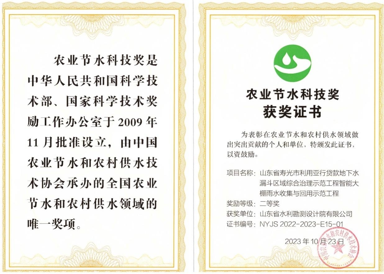 農(nóng)業(yè)節(jié)水科技獎(jiǎng)是中華人民共和國(guó)科學(xué)技術(shù)部、國(guó)家科學(xué)技術(shù)獎(jiǎng)勵(lì)辦公室于2009年11月批準(zhǔn)設(shè)立,由中國(guó)農(nóng)業(yè)節(jié)水和農(nóng)村供水技術(shù)協(xié)會(huì)承辦的全國(guó)農(nóng)業(yè)節(jié)水和農(nóng)村供水領(lǐng)域的唯一獎(jiǎng)項(xiàng)。近日,由山東省水利勘測(cè)設(shè)計(jì)院有限公司發(fā)展規(guī)劃院牽頭完成的《山東省壽光市利用亞行貸款地下水漏斗區(qū)域綜合治理示范工程智能大棚雨水收集與回用示范工程》技術(shù)成果,喜獲第九屆農(nóng)業(yè)節(jié)水科技獎(jiǎng)二等獎(jiǎng)(規(guī)劃設(shè)計(jì)類)。