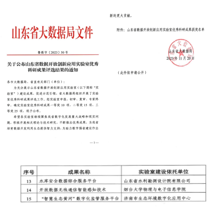 近日,山東省水利勘測(cè)設(shè)計(jì)院有限公司(以下簡(jiǎn)稱山東水設(shè))智慧水利院(技術(shù)研發(fā)中心)的水庫(kù)安全數(shù)據(jù)綜合服務(wù)平臺(tái)研發(fā)成果,獲得2023全省數(shù)據(jù)開放創(chuàng)新應(yīng)用實(shí)驗(yàn)室優(yōu)秀科研成果二等獎(jiǎng)。