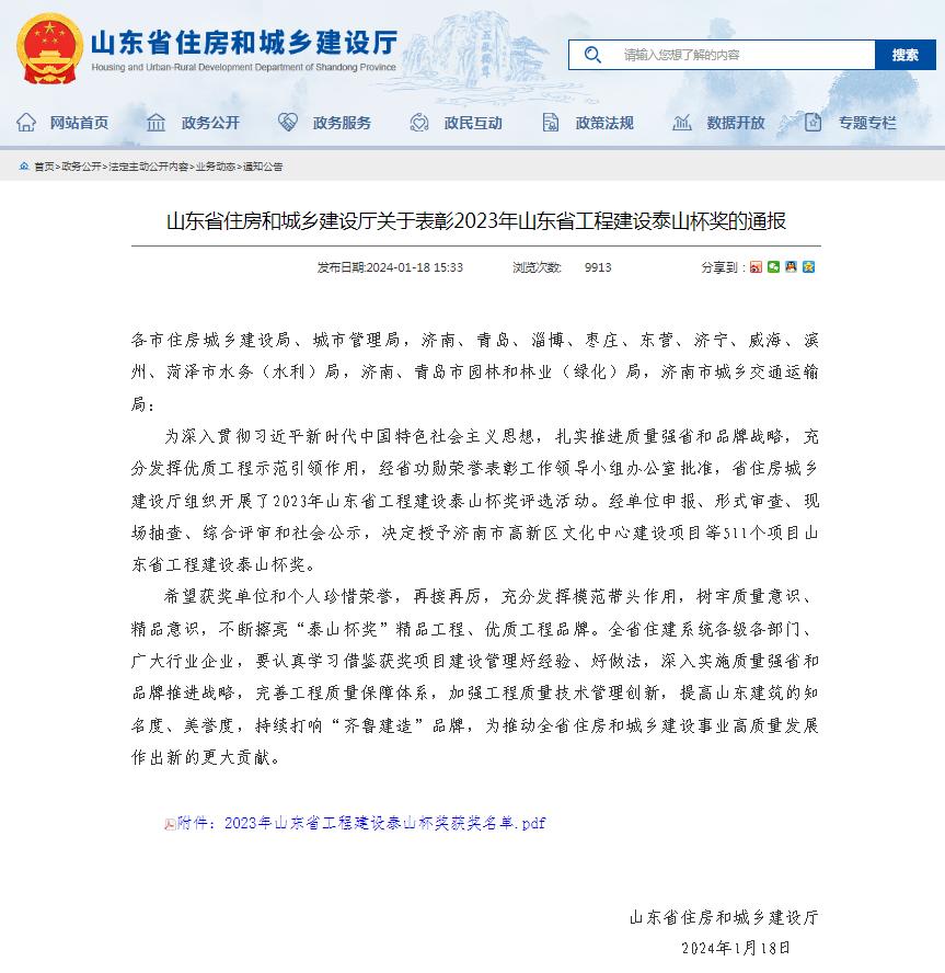 近日,山東省住房和城鄉(xiāng)建設(shè)廳印發(fā)《關(guān)于表彰2023年山東省工程建設(shè)泰山杯獎(jiǎng)的通報(bào)》,發(fā)布了2023年泰山杯獎(jiǎng)獲獎(jiǎng)項(xiàng)目名單,山東省16項(xiàng)水利工程榮獲省2023年工程建設(shè)“泰山杯”獎(jiǎng),其中9個(gè)項(xiàng)目為山東省水利勘測(cè)設(shè)計(jì)院有限公司(以下簡(jiǎn)稱(chēng)公司總部)及權(quán)屬企業(yè)參建完成。