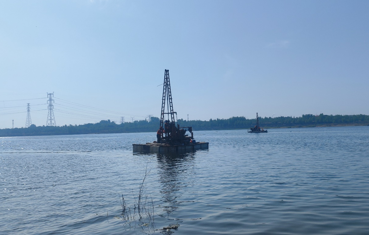 場區(qū)位于沂沭斷裂帶影響范圍內(nèi),地質(zhì)構(gòu)造復(fù)雜,灰?guī)r溶洞、溶溝、溶槽較發(fā)育,存在滲漏等風險。我公司充分發(fā)揮勘察技術(shù)優(yōu)勢,采用地質(zhì)測繪、鉆探、物探、水文試驗等手段,同時使用自主研制的模塊式水上鉆探平臺進行水上作業(yè),該平臺具有可自由拼裝拆卸,浮力大、平穩(wěn)安全等優(yōu)點。基本查明了場區(qū)的工程地質(zhì)及水文地質(zhì)條件,為項目實施奠定了堅實基礎(chǔ)。