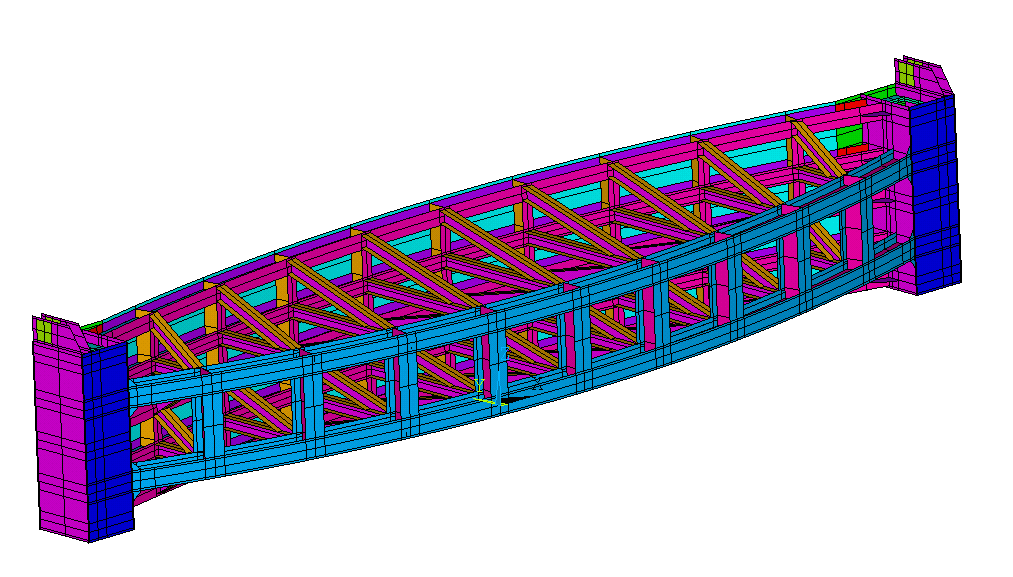 3.利用空間有限元分析方法,首次深入研究了大跨度雙拱板桁曲面閘門及雙拱管桁曲面閘門的應(yīng)力、變形、自由振動和整體穩(wěn)定特點,其成果為該類閘門的結(jié)構(gòu)設(shè)計和應(yīng)用提供了理論基礎(chǔ)。結(jié)果表明,雙拱曲面結(jié)構(gòu)使得閘門跨中應(yīng)力峰值有效減小,應(yīng)力分布均勻;閘門剛度增大,各工況荷載作用下的結(jié)構(gòu)變形減?。唤Y(jié)構(gòu)應(yīng)力和剛度沒有明顯較弱部位;在大、中跨度方面顯示出較大的優(yōu)勢,節(jié)省閘門用鋼量。
