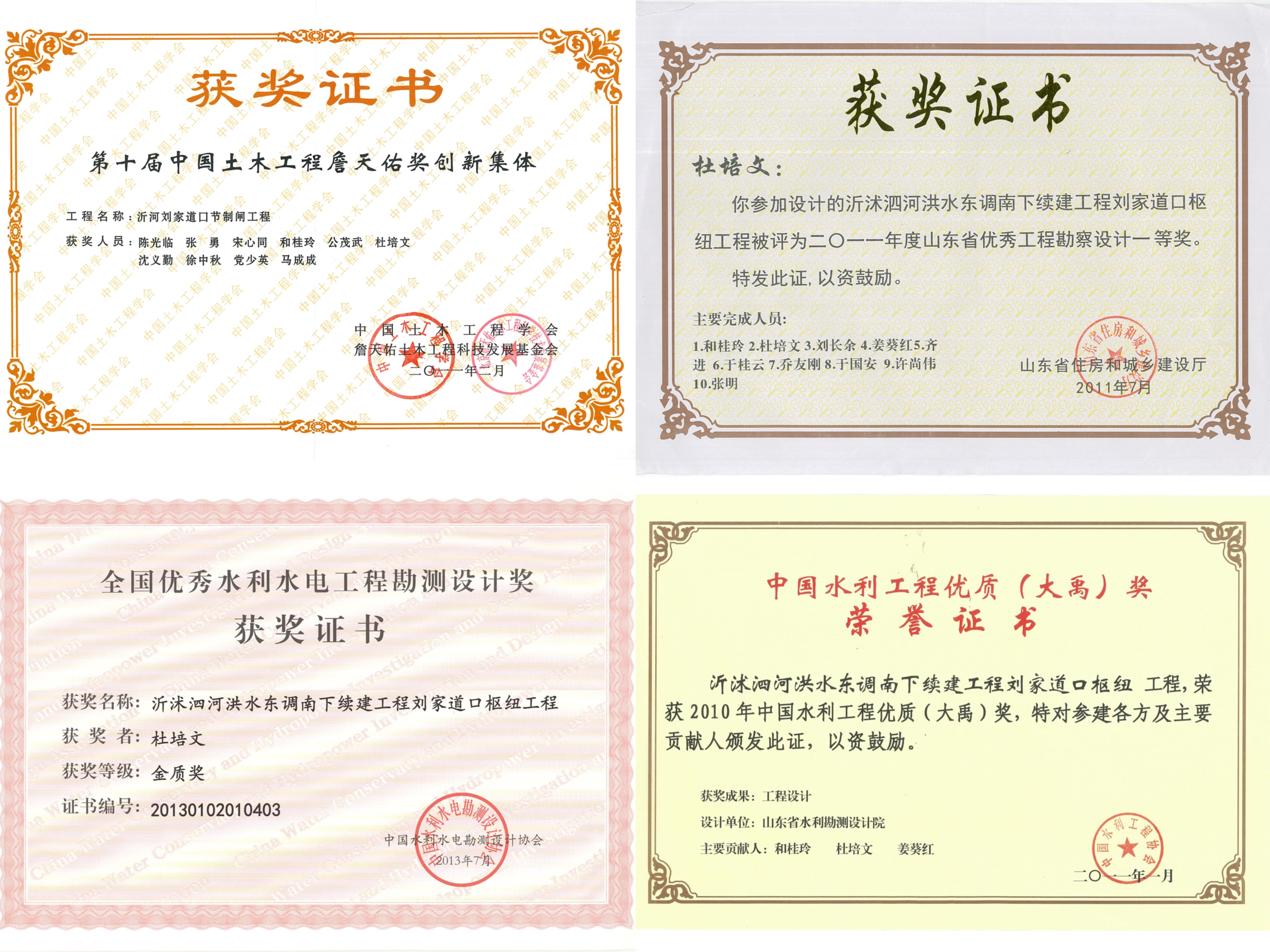 工程項目成果強地震區(qū)大型水閘金屬結(jié)構(gòu)關(guān)鍵技術(shù)研究與實踐,獲得2009年山東省科技進步三等獎。劉家道口樞紐工程榮獲2011年度山東省優(yōu)秀工程勘察設(shè)計一等獎;2010年中國水利工程優(yōu)質(zhì)(大禹)獎;2013年全國優(yōu)秀水利水電工程勘測設(shè)計金質(zhì)獎。劉家道口節(jié)制閘榮獲第十屆中國土木工程詹天佑獎。