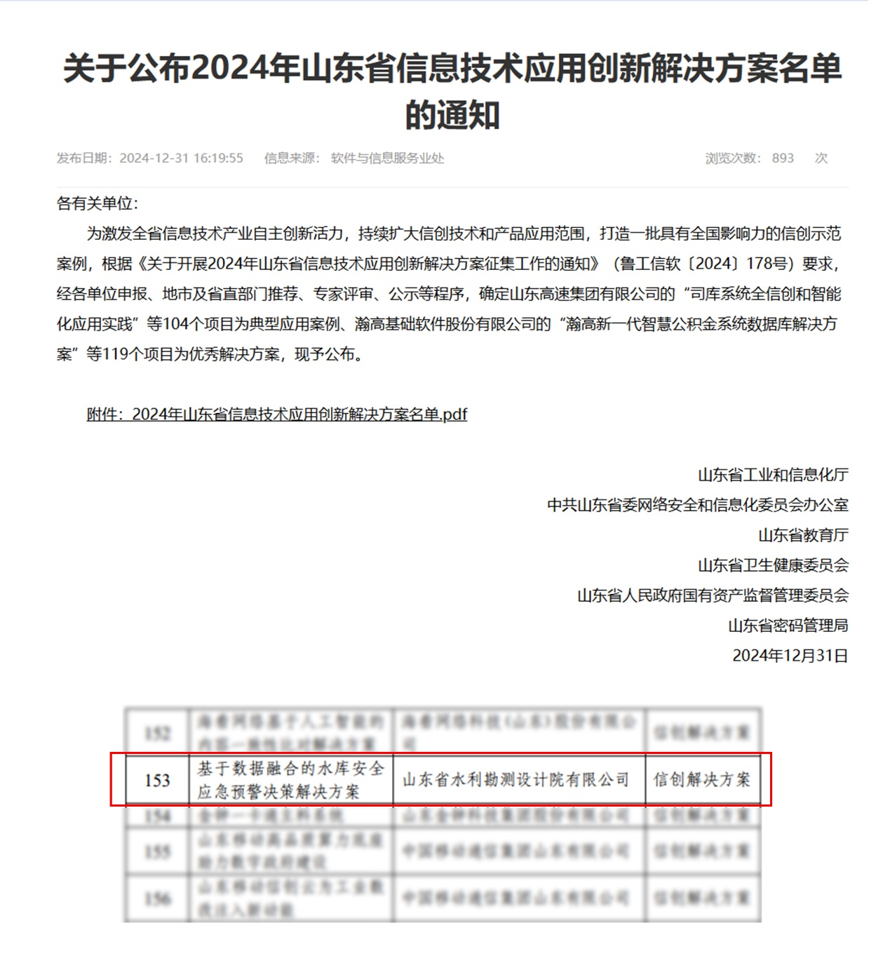 近日,山東省工業(yè)和信息化廳、省委網(wǎng)信辦、省教育廳、省衛(wèi)生健康委、省國(guó)資委、省密碼局聯(lián)合公布了2024年山東省信息技術(shù)應(yīng)用創(chuàng)新解決方案名單,山東省水利勘測(cè)設(shè)計(jì)院有限公司(以下簡(jiǎn)稱山東水設(shè))自主研發(fā)的“基于數(shù)據(jù)融合的水庫(kù)安全應(yīng)急預(yù)警決策解決方案”被評(píng)為“信創(chuàng)解決方案”。