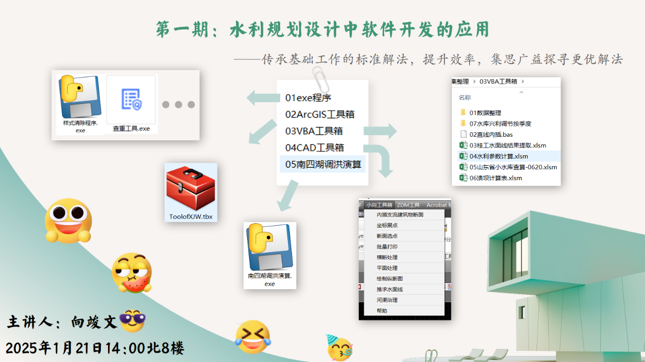 此次交流會(huì)內(nèi)容分為兩個(gè)部分:一是《時(shí)代浪潮中的設(shè)計(jì)院——青年設(shè)計(jì)師的使命與展望》,提出2035年基本實(shí)現(xiàn)AI設(shè)計(jì)、2050年全面實(shí)現(xiàn)智慧設(shè)計(jì)的暢想。鼓勵(lì)青年設(shè)計(jì)師認(rèn)清水利設(shè)計(jì)行業(yè)發(fā)展趨勢(shì),抓住AI+水利風(fēng)口,實(shí)現(xiàn)個(gè)人發(fā)展。二是《水利規(guī)劃設(shè)計(jì)中軟件開發(fā)的應(yīng)用——高效與創(chuàng)新》,針對(duì)規(guī)范查重、編制報(bào)告中Word文檔格式的規(guī)范統(tǒng)一、ArcGIS提取斷面數(shù)據(jù)、優(yōu)化河道治理過程中的水面線計(jì)算、橫縱斷面繪制等問題,分享16項(xiàng)自研程序;針對(duì)工程量計(jì)算、制圖、編寫報(bào)告等基礎(chǔ)工作,提出了匯編標(biāo)準(zhǔn)解法的倡議,提升工作效率。