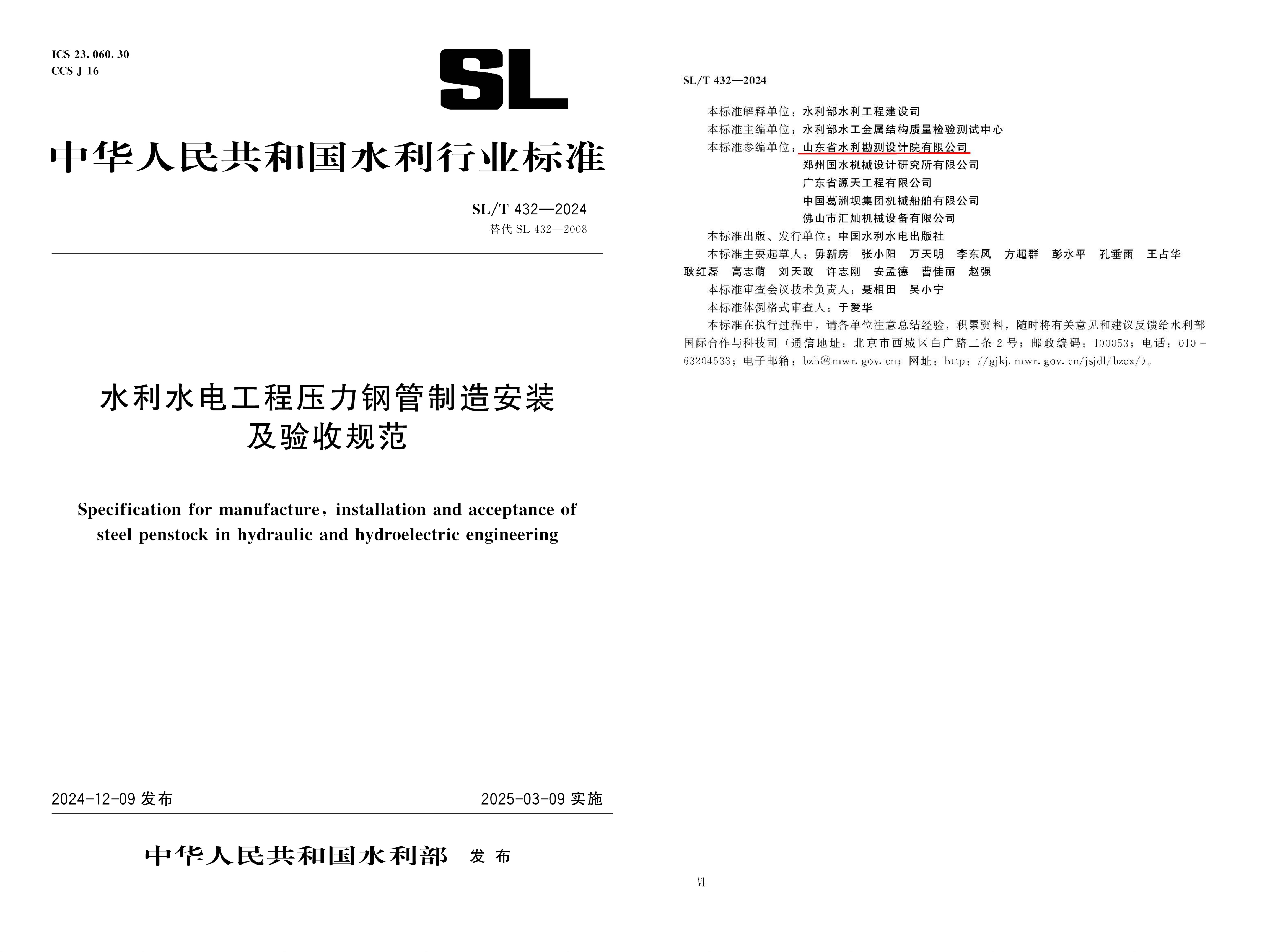 近日,由山東水設(shè)作為主要參編單位參與編制的《水利水電工程壓力鋼管制造安裝及驗(yàn)收規(guī)范》(SL/T 432—2024)經(jīng)水利部批準(zhǔn),正式面向全國發(fā)布實(shí)施。該規(guī)范是我國在壓力鋼管制造安裝與驗(yàn)收領(lǐng)域的重要技術(shù)規(guī)范,自2008年發(fā)布以來,被水利行業(yè)設(shè)計(jì)、制造、安裝、監(jiān)理、檢測等單位廣泛采用,是水利工程壓力鋼管制造、安裝及驗(yàn)收的重要依據(jù),在規(guī)范我國水利工程壓力鋼管制造、安裝及驗(yàn)收工作中發(fā)揮了重要作用。但隨著我國引調(diào)水工程、抽水蓄能電站和泵站工程的發(fā)展,其適用范圍已不能滿足現(xiàn)狀水利水電工程建設(shè)的需要。本次修訂可加強(qiáng)對整個水利水電行業(yè)壓力鋼管的質(zhì)量管理,規(guī)范壓力鋼管行業(yè)發(fā)展,提高壓力鋼管的可靠性和企業(yè)技術(shù)水平,對保證水利工程壓力鋼管安全運(yùn)行起到重要的技術(shù)支撐作用。