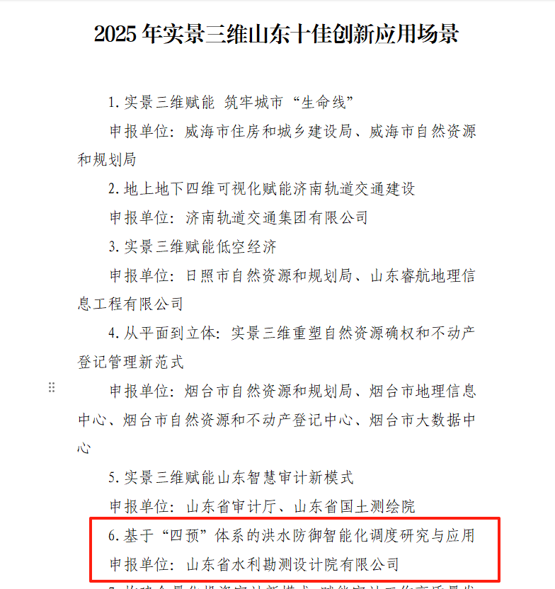近日,山東省自然資源廳正式公布了2025年實景三維山東十佳創(chuàng)新應用場景評選結(jié)果,我公司申報的“基于‘四預’體系的洪水防御智能化調(diào)度研究與應用”系統(tǒng)成功入選十佳創(chuàng)新應用場景。