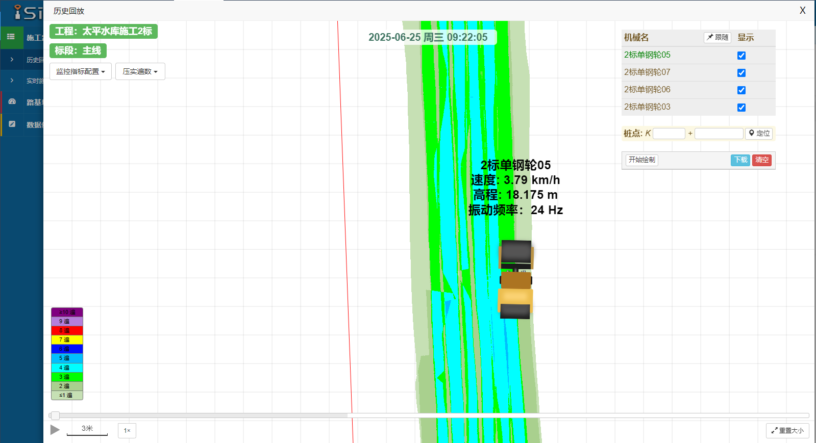 太平水庫碾壓施工智慧管控系統(tǒng),通過在碾壓機械上安裝北斗定位天線、VCV傳感器以及終端顯示平板,實時監(jiān)控碾壓機械的軌跡、速度、遍數(shù)、是否開振等指標(biāo),對攤鋪及碾壓進行全過程數(shù)據(jù)采集、傳輸、統(tǒng)計分析、智能反饋和三維動態(tài)施工仿真模擬,并借助現(xiàn)場采集的施工參數(shù),對施工質(zhì)量進行快速評價與控制。