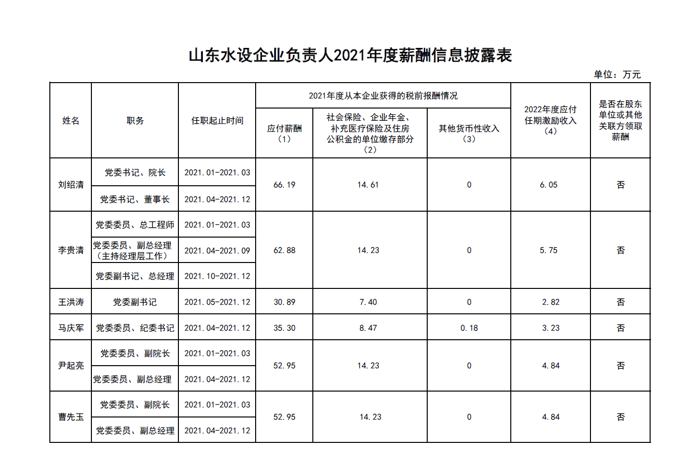 山東水設(shè)企業(yè)負責(zé)人2021年度薪酬信息披露表